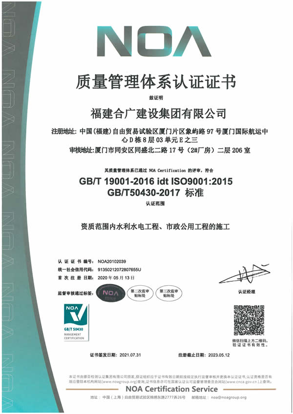 福建合廣建設集團有限公司,注冊資本5188萬元人民幣,公司位于廈門市同安區(qū)鳳山一里151-17號。本公司成立于2013年,公司具備市政公用工程、水利水電工程、房屋建筑工程、公路工程、園林綠化等多專業(yè)施工資質。企業(yè)從業(yè)人員100多人,各類專業(yè)技術人員70多人,其中高級職稱8人,中級職稱40多人,一級建造師6人,二級建造師15多人。